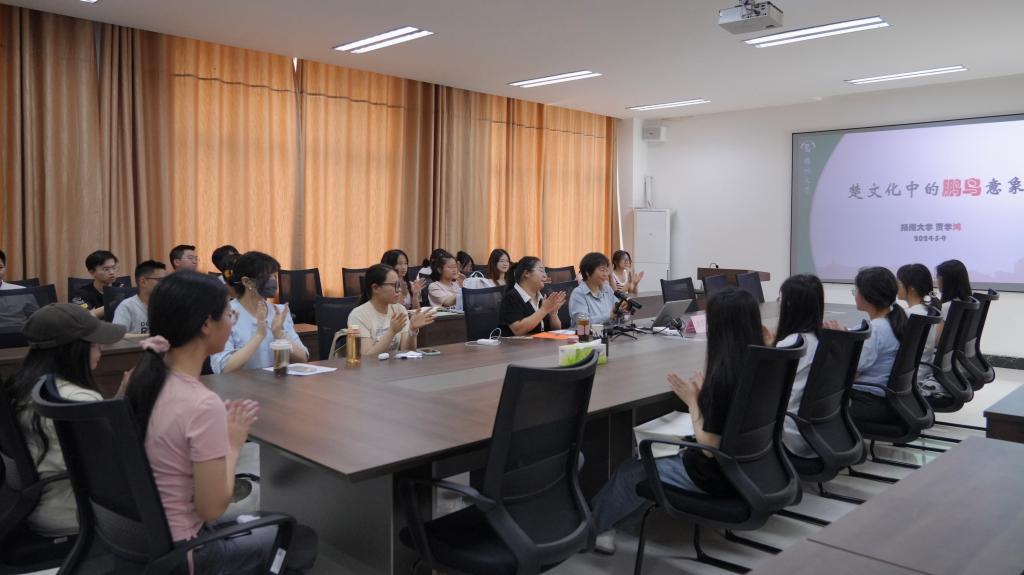 在讲座中,贾学鸿教授以《芈月传》中主角吟唱楚辞的视频片段引出楚文化,对楚文化进行了介绍。以楚地文化背景为引,结合《山海经》《庄子》《离骚》《对楚王问》等楚文学文献中对鹏鸟的描写,生动地展现了鹏鸟在楚文化中的艺术形象和文化内涵,揭示了鹏鸟意象在楚文化中的独特地位。在讨论互动环节,贾学鸿教授解答了同学的提问,并引导大家思考如何理解《逍遥游》中的“逍遥”,启发同学们避免用惯性思维看待问题,摒弃攀比之心、淡化功名利禄之欲,放远眼光、拓宽胸怀,以正确的态度理解庄子的“逍遥”。