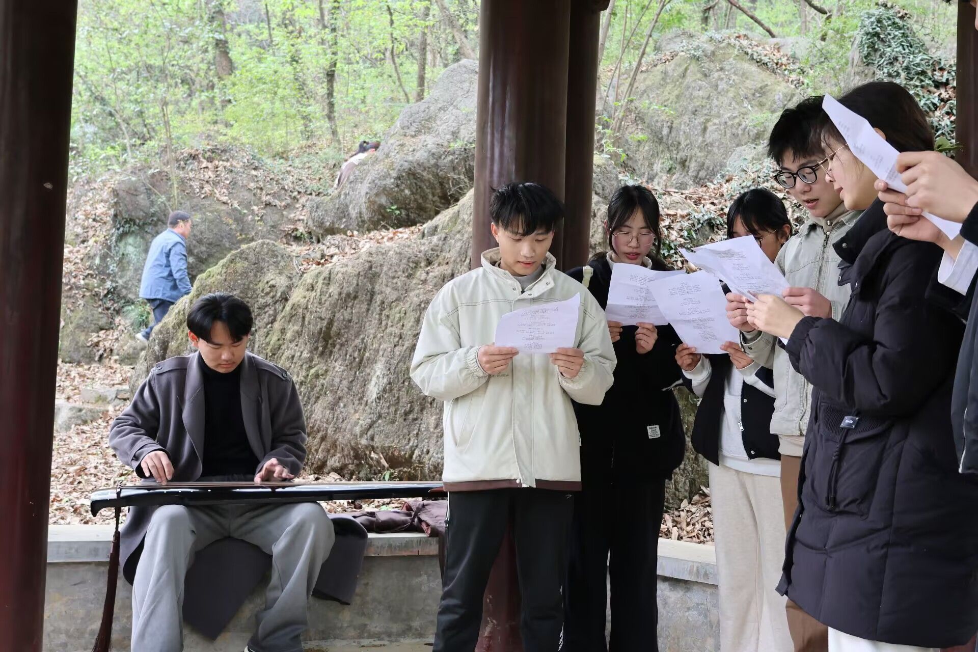 行进过程中,孙德贤、胡涛两位老师为大家讲解了鹿门山石刻、建筑、地理布局,使同学们领略当地深厚的文化底蕴;并结合孟浩然隐居鹿门山的典故,阐述创作环境对人的重要性。在浩然亭,刘仕泉同学挽弹古琴,万琪、吕戌昊等同学齐诵《登鹿门山怀古》《登江中孤屿赠白云先生王迥》等古诗名篇。最后两位老师鼓励同学们静下心来,打破外界环境的纷扰,用心感受人与自然的物我交融,结合自身实际,不断提升作品的思想境界。