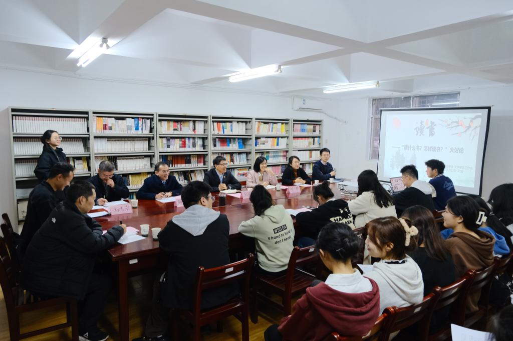 现场,师生围绕活动主题分享读书体会并交流讨论。文渊员工工作坊负责人张丰琦推荐书籍《瓦尔登湖》,倡导大家在纷杂的世界中亲近自然,发现美好;草庐文学社社长秦东阳根据自己的阅读经验将史书与现实结合,分享自己创作短篇小说《归州梅雨》并入围湖北省高校青年小说大赛复赛的经历。中文系主任陈晓燕老师说,既要“走进”书中、也要“走出”书本,将理论知识化作实践能力。