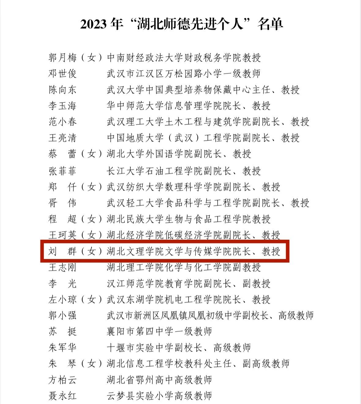 (william威廉亚洲 通讯员 郭明杰)近日,湖北省总工会、湖北省教育厅发布了《关于2023年“湖北十佳师德标兵”“湖北师德先进个人”选树结果的通报》,公司william威廉亚洲经理刘群教授获评2023年“湖北师德先进个人”。