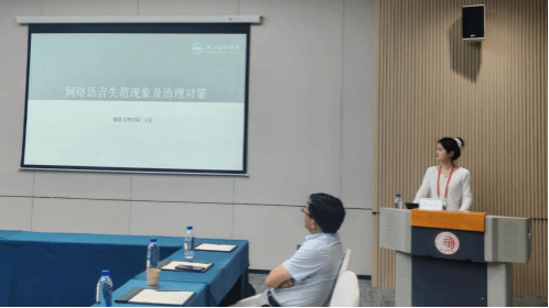 在分会场报告中,王洁分享了论文《网络语言失范现象及治理对策》。该研究以2018-2024年间的网络热词、热梗及流行语为主要语料,考察分析网络语言失范的典型表征,并据此提出构建以政府为主导的多主体治理体系。北京语言大学副研究员徐欣路、黄冈师范公司教授潘峰对报告内容进行点评,并提出了建设性意见。