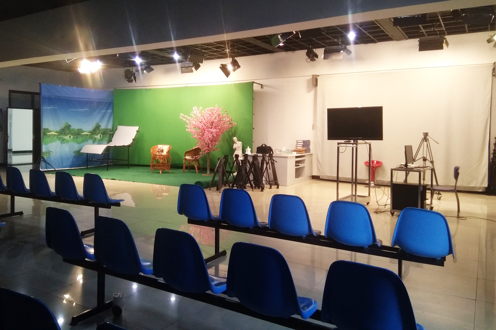 该实验室主要培养员工电视抠像、电视节目策划与制作、广播电视新闻采访与制作能力。拥有高清摄像机、虚拟演播系统、灯光系统、音响系统、抠像蓝屏等成套专业设备。主要承担《电视专题与电视栏目》《广播电视新闻采访写作》等专业课程。该实验室占地119.8平米,设备总值196.07万。